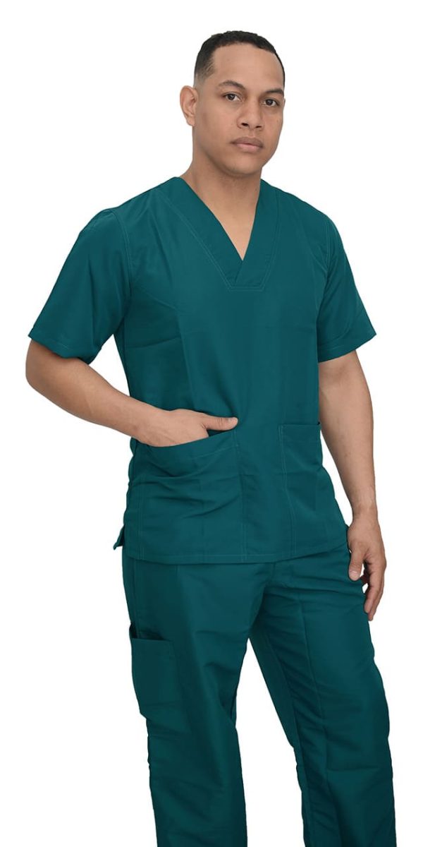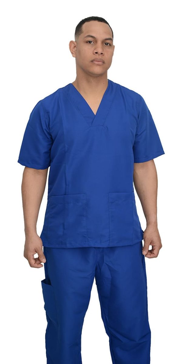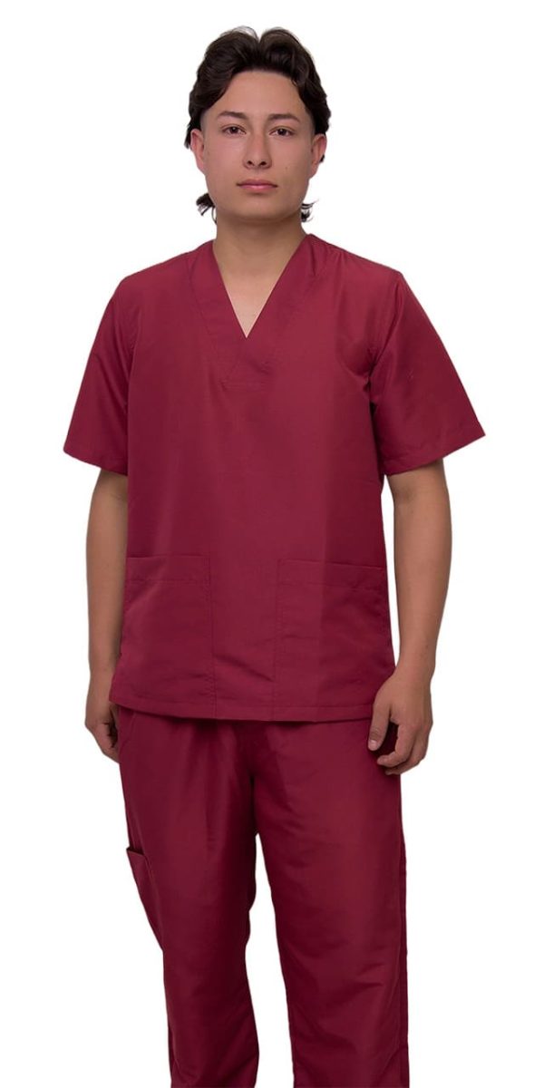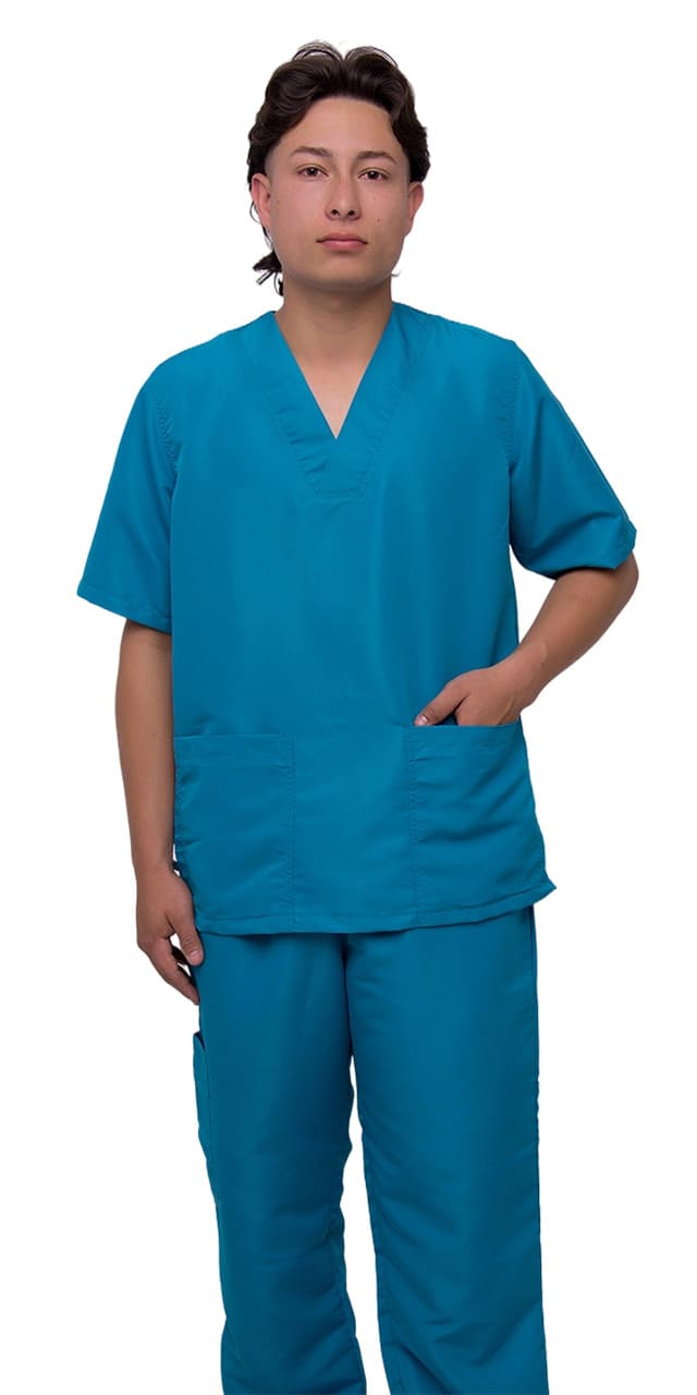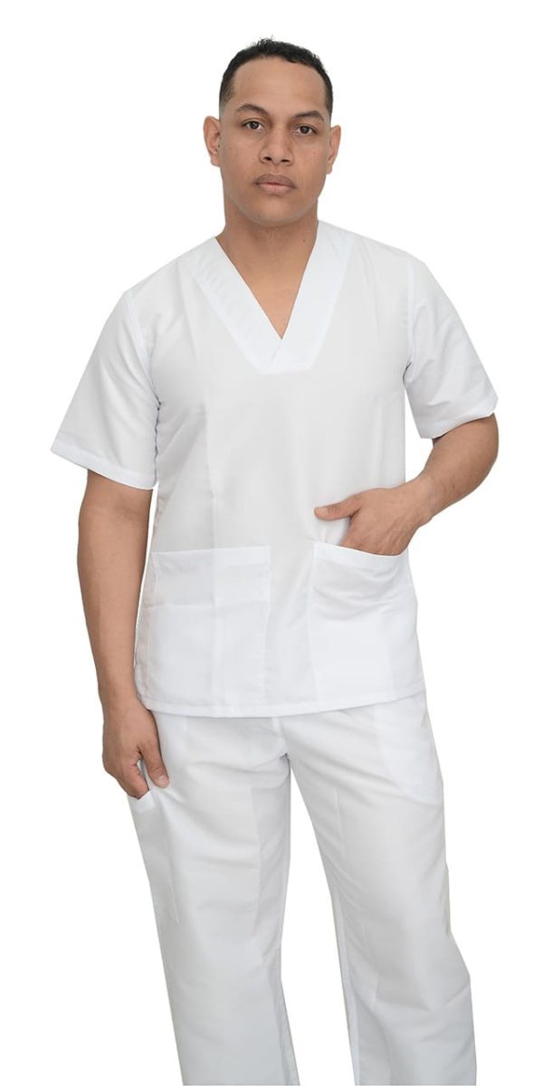 Diseño básico unisex, cuello en V con muy buena terminación en la confección, tela antifluido nacional, clororesistente, antibacterial, repele hasta un 80% los fluidos