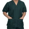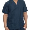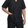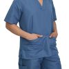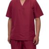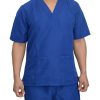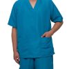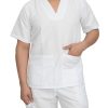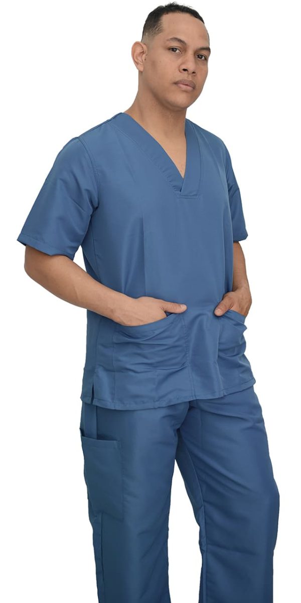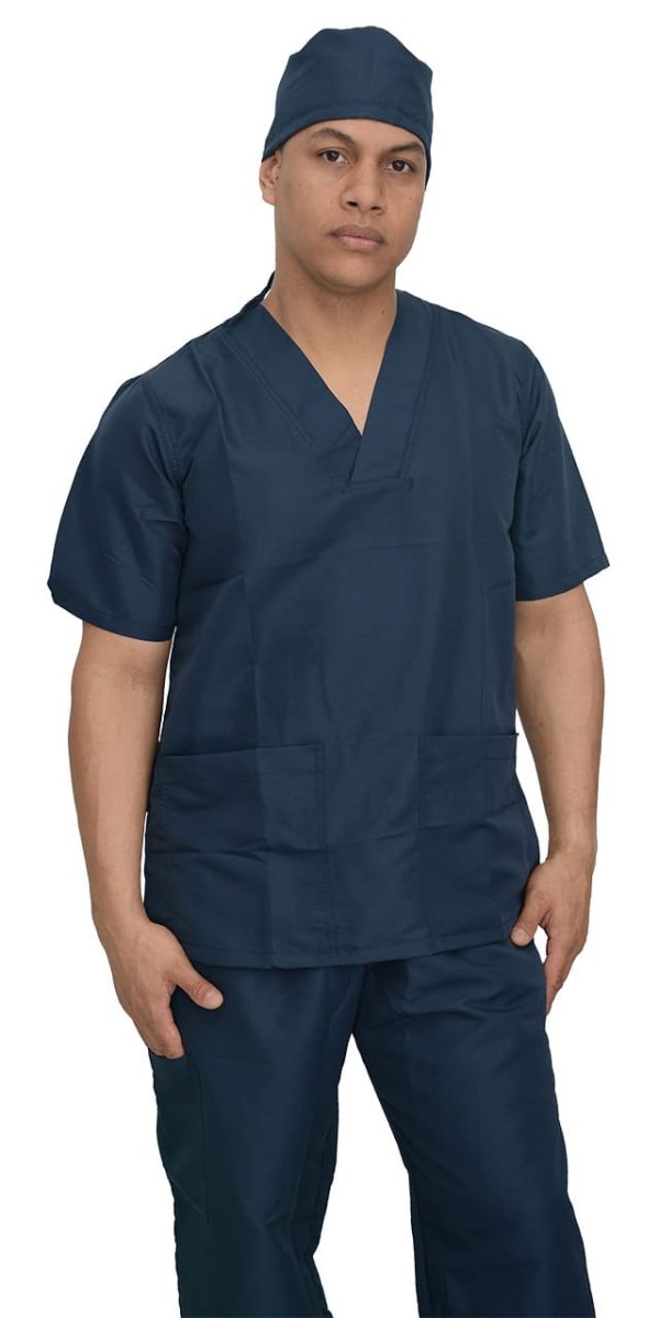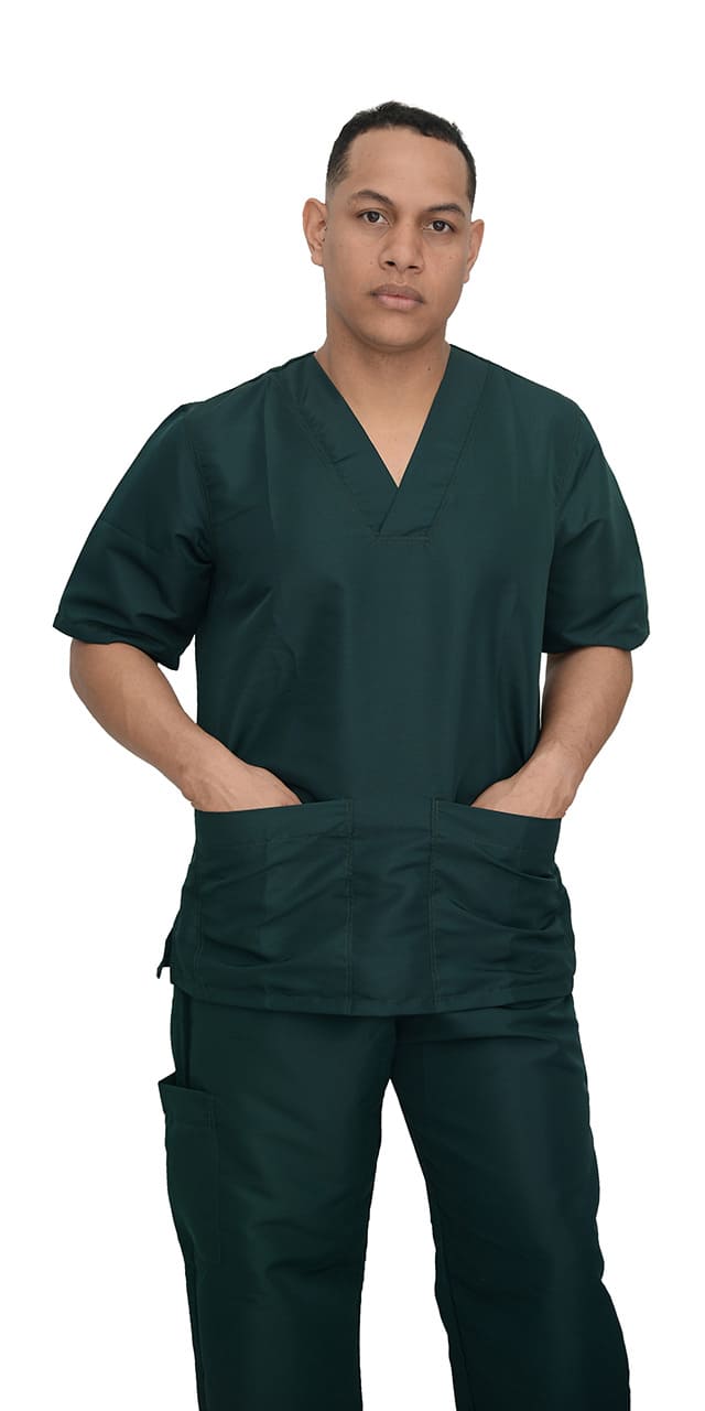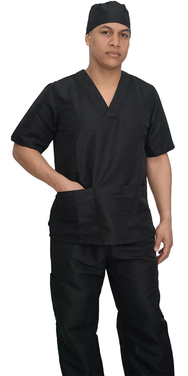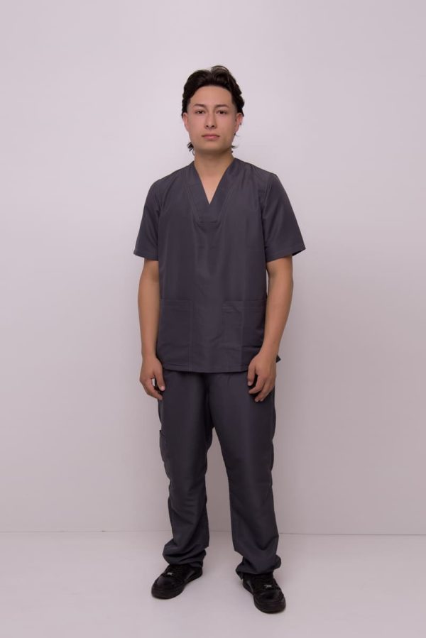 Diseño básico unisex, cuello en V con muy buena terminación en la confección, tela antifluido nacional, clororesistente, antibacterial, repele hasta un 80% los fluidos