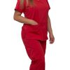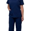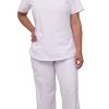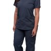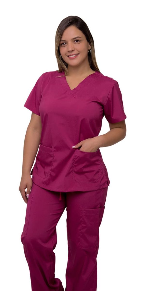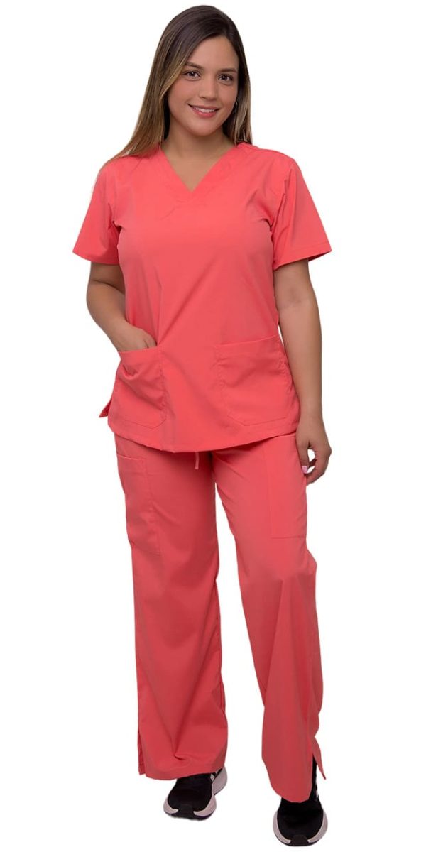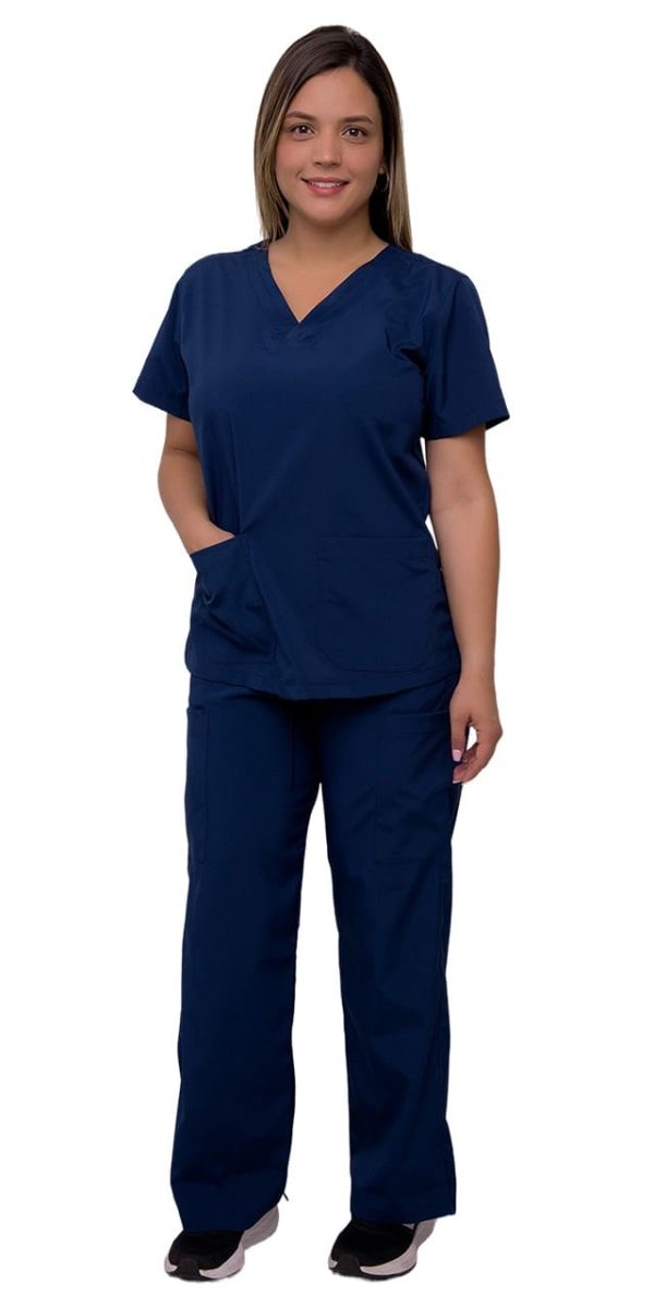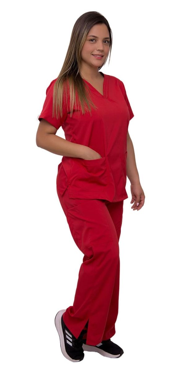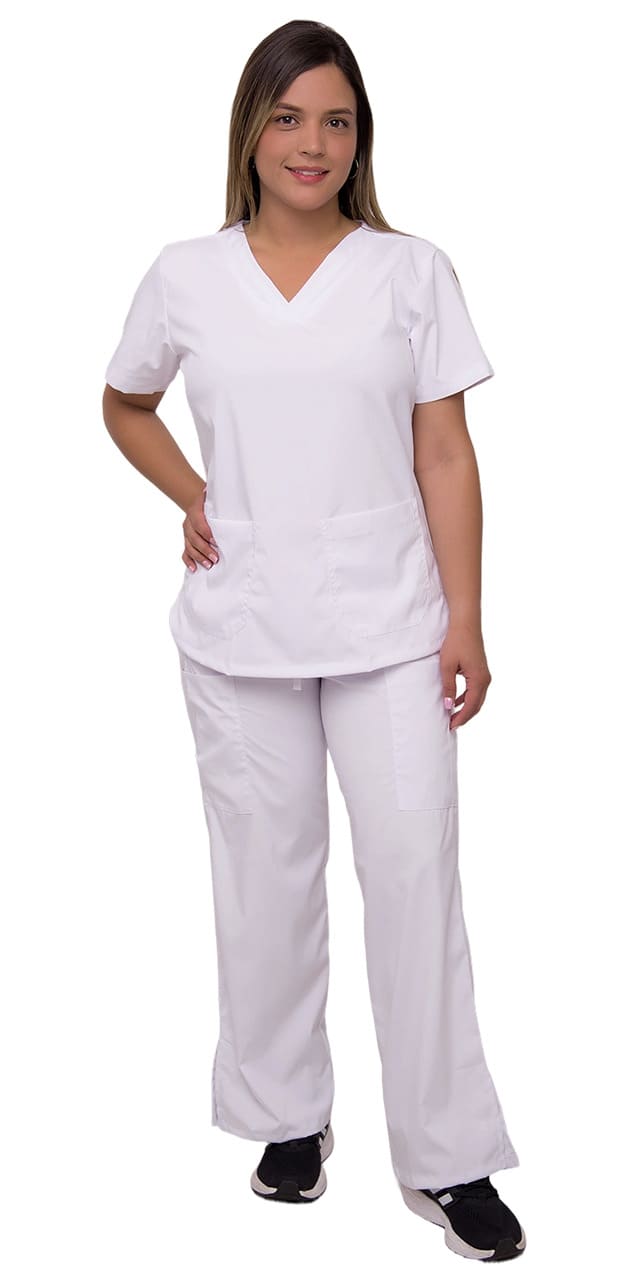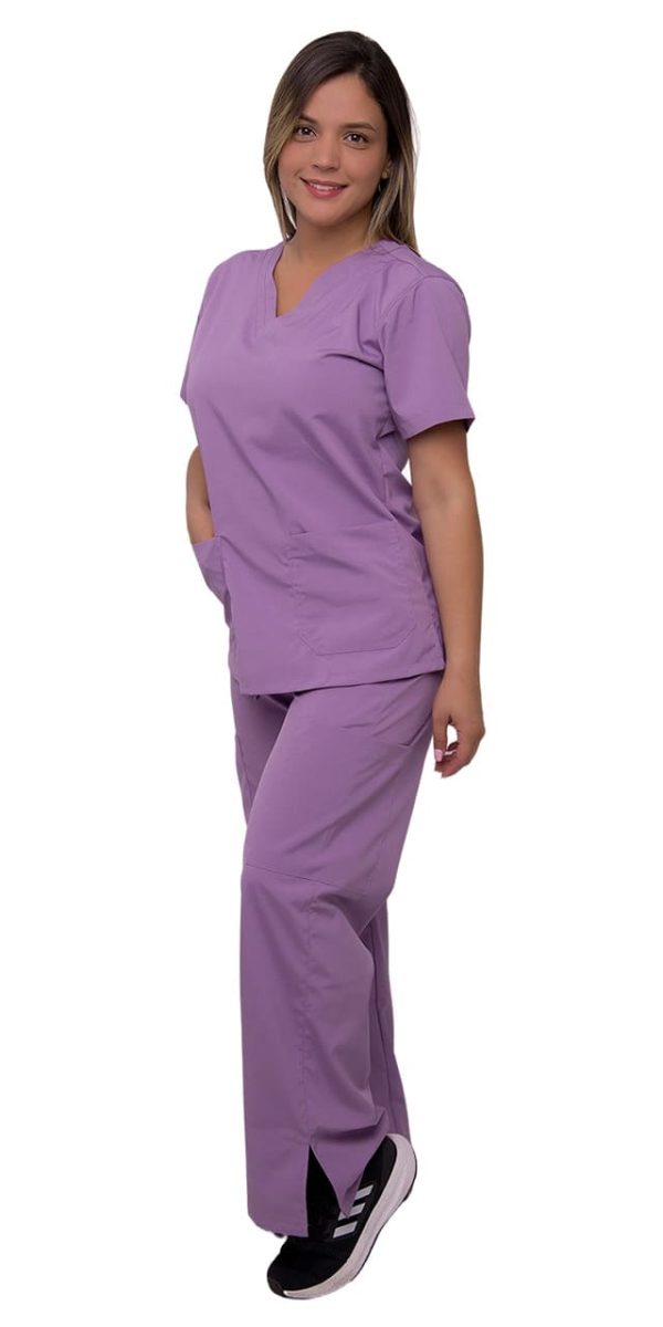 Uniforme antifluido lycrado, sin cierres, pantalón bota recta con abertura lateral y multibolsillos